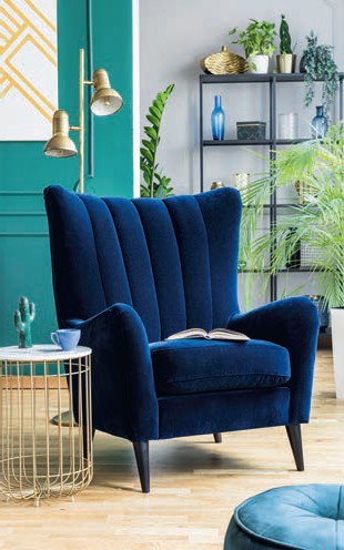 Odcienie niebieskiego mają swoje ważne miejsce w przyrodzie, stąd wywodzi się wiele przypisywanych im cech uzasadniających ich obecność w aranżacjach wnętrz. To kolor otwartej przestrzeni, nieba i czystej wody. Niebieskości w naturze wywodzą się ze zjawisk optycznych. Bezchmurne niebo jest niebieskie z powodu tzw. efektu Rayleigha (rozpraszanie światła na cząsteczkach atmosfery), natomiast lekko niebieska barwa czystej wody wynika z częściowego pochłaniania przez nią czerwonej składowej światła białego. To dlatego kolor ten kojarzy się z odczuciem dali, przestronności, czystości. W przeciwieństwie do innych barwników łatwo dostępnych w naturze niebieski uważany był za barwę szlachetną, jedną z najtrudniej osiągalnych i drogich. Przez wiele stuleci otrzymywano go ze sproszkowanego lazurytu, minerału cenionego bardziej od złota. Wraz z rozwojem handlu morskiego stał się popularny w naszej kulturze i wtedy nadano mu nazwę azurreum ultramarinarum, co znaczy „lazuryt zza morza”. Był to ostatni odcień podstawowy uzyskany w sposób sztuczny przez człowieka. Wynalezienie syntetycznej ultramaryny na początku XIX wieku upowszechniło ten kolor, wtedy też stał się popularną barwą elewacji polskich chałup wiejskich. Dlaczego domy malowano właśnie na niebiesko? Wybór uzasadniano względami praktycznymi – wierzono, że kolor ten chroni je przed insektami – odstrasza owady, w przeciwieństwie do żółtego, który je przyciąga. Mieszkańcy odkryli również, że gdy dodadzą do wapna ultramaryny, kury nie dziobią ścian domu. Uważano też, że niebieski ma właściwości antyzapalne. No i wreszcie nie bez znaczenia była symbolika barwy niebieskiej, jako niebiańskiej, chroniącej przed złem. Nazwa koloru wywodzi się przecież od słowa „niebo” – do XIV wieku w języku polskim „niebieski” oznaczało „przynależny do nieba”. Kolorem tym malowano szaty Maryi, podkreślając w ten sposób jej związek z niebem. Dopiero później termin ten został przyjęty jako określenie barwy. Kolor niebieski w naszym kręgu kulturowym związany jest również z kreatywnością. Wystarczy spojrzeć na prace Picassa – miał on w swojej twórczości tzw. okres niebieski – czy sylwetkę francuskiego awangardzisty Yvesa Kleina, który swój ulubiony malarski odcień opatentował pod nazwą International Klein Blue. Szlachetny granatowy zadomowił się we wnętrzach przedwojennego stylu art déco, jako bazowy kolor boazerii czy tapet. Również dzisiaj doskonale prezentuje się w połączeniu z różnymi wzorami charakterystycznymi dla art déco, takimi jak romby, zygzaki czy tzw. marokańskie koniczyny. Po II wojnie światowej niebieski obecny był też w polskim dizajnie lat 60. i 70., gdzie śmiało łączono go z zielonym, często dodając do obu kolorów odcienie rudości. Wywodzące się z tego okresu zestawienia kolorystyczne to również źródło współczesnych inspiracji stylu mind cenaury modern.