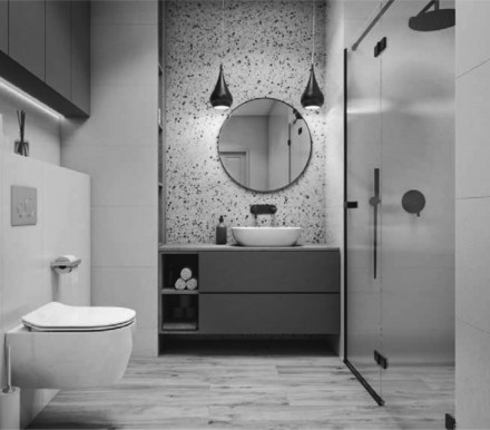 - Precyzyjnie dobierajmy formaty. Nawet jeśli jesteśmy zakochani w cegiełkach układanych np. w jodełkę, zweryfikujmy to rozwiązanie, „przymierzając” je do konkretnego wnętrza – cięcia z boków oraz od góry wyglądają bardzo nieestetycznie. Podczas podejmowania decyzji, bardzo ważną rolę odgrywają dobrze przeprowadzone pomiary każdego elementu – obudowy WC, kabiny prysznicowej, pasa ściany nad umywalką, który chcemy wyróżnić inną okładziną lub odrębnym formatem płytek. Projekt powinien uwzględnić zarówno grubość materiałów, które będziemy łączyć, jak i fugi.