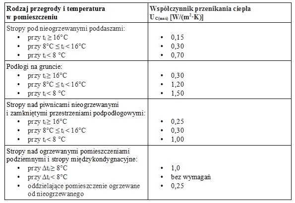 Współczynnik przenikania ciepła przegród poziomych, zależy do ich rodzaju oraz temperatury panującej w pomieszczeniu. Maksymalne wartości obowiązujące od 2021 r. przedstawiamy w tabeli.